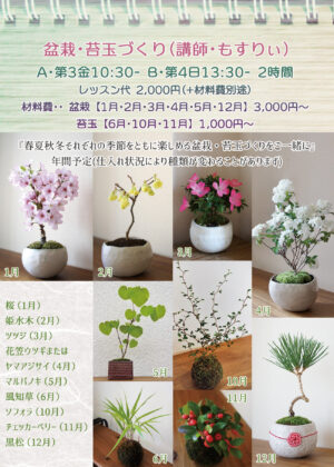 『春夏秋冬それぞれの季節をともに楽しめる盆栽・苔玉づくりをご一緒に』 それぞれの季節にあった植物をつかって盆栽、苔玉をつくっていきます。完成後、季節の移ろいとともに変化していく様子をすぐそばで眺めながら、わくわく、どきどき、ほっこり、そんな時間をお届けできたらと思っています。はじめての方でも、ゆっくりと一緒に作っていきたいと思っています。その後の育て方なども詳しく説明いたしますので、お気軽にご参加ください