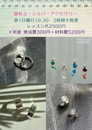 MYMYの銀粘土アクセサリー(アートクレイシルバー)教室では、オリジナルの指輪やピアス、ネックレスが作れます☆ また、月毎にレッスンで作って頂くサンプルも用意しています! 自分だけの銀細工・シルバーアクセサリーを一緒に楽しく作りましょう!