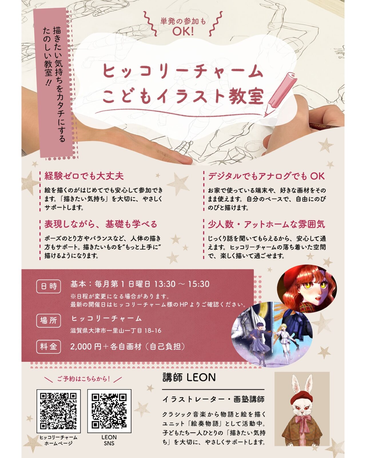 このイベントは04 10月 2025に終了しました 振替)イラスト(子ども)教室で「別クラス」や「追加日程」がある場合は、 こちらのページに表示しています 振替)イラスト(子ども)教室 についてイラストレーターLEONによる、子ども向けイラスト教室です。「とにかく絵を描くのが大好き!」なLEONと一緒に、自分だけの世界を自由に、楽しく描いてみませんか? 授業では、想像力や発想力を大切にしながら、“描きたい気持ち”をカタチにするお手伝いをしていきます。 ・デジタルでもアナログでもOK! ・絵の経験がなくても大丈夫! ・描きたい気持ちがあれば、誰でも大歓迎! 「好き」や「自分らしさ」を大切にしながら、あなたの世界を自由に描いていきましょう! LEONクラシック音楽を専門に学び、幼いころから親しんできた「絵を描くこと」とのふたつの“好き”を掛け合わせ、クラシック音楽からインスピレーションを得た絵と物語を創作している。現在は、絵と音楽を組み合わせた創作ユニット「絵奏物語」のメンバーとして活動中。絵と音楽を使ったイベントを、滋賀県を中心に企画・開催している。ホームページ(自己紹介等) 絵奏物語 日程や持ち物日程毎月第1日曜日 13:30-15:30料金2000円+各自画材(自己負担)持ち物各自、イラストに必要な画材全て ・アナログで描く方は、ペンや色塗り用の画材、使用する紙などを持ってきてください。 ・デジタルで描く方は、普段使用している端末を持ってきてください。備考講師による画材などの貸し出しは基本的に行なっておりません。 ↑クリックで拡大します こんな教室です(生徒作品など)[6月~]子どもイラスト教室・講師のご紹介 … 初夏?5月分が近づいています!⇒イラスト教室の投稿一覧フォトギャラリー « prev 1 2 next » (17 Photos)お申込・お問い合わせはこちらからフォームまたは077-532-6564までお気軽にお問い合わせください。お電話受付時間10-18時・(水曜日木曜日・第1金土・イベント日をのぞく)生徒様へのお願い→当店のコロナウィルス対策(ブログ記事)混雑を避けるためできるだけ受講されるご本人のみでご参加下さい(お迎えの時間は先生の方にご確認をお願いします)。基礎疾患をお持ちの方や高齢者等重症化リスクが高い方が同席する場合はマスクの着用をお願いする場合があります。具合の悪い場合の出席はお控えください。 ■お名前 (必須) ■メールアドレス (必須) ■電話番号 (必須) ■件名 (必須) 『振替)イラスト(子ども)』へのお申込み その他 ■参加希望日(空白の場合は直近の開催日指定となります) ■受講人数(密を避けるため、小学校高学年以上のお子様への付き添いはご遠慮ください) 親子割→お子様料金から500円引させていただきます■お問い合わせ内容欠席連絡→直接先生までお願いします(リピート受講時) このサイトはreCAPTCHAによって保護されており、Googleの プライバシーポリシーと利用規約が適用されます。 dt_sc_one_half] [dt_sc_titlTOPへ 講師用:ブログ投稿 / 人数 ( このイベントは04 10月 2025に終了しました ) 別クラス・追加日程 / 管理者用